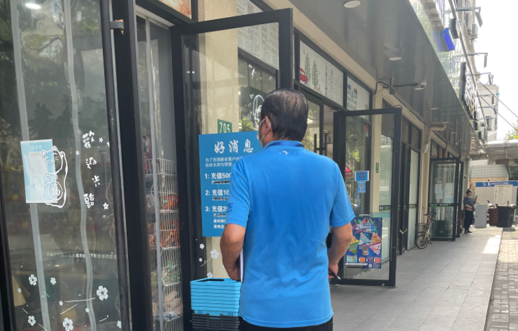 林國榮負責的路段有近70家商鋪,每天上午、下午和晚上,他要在這里走上三趟。近一個月下來,林國榮已是大家的“老熟人”,沿街商鋪的經營者們親切地喊他“林老師”。