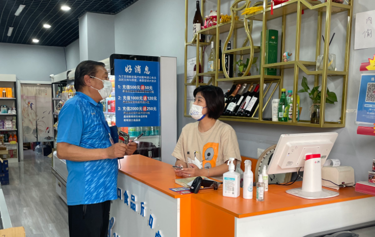 在巡查中,每到一個商鋪,場所碼的張貼、“數字哨兵”的設置、工作人員的核酸報告等都是林國榮關注的重點。在一個超市內,林國榮一邊詢問超市公共部位有無定期消毒,一邊仔細查看相關記錄。當看到超市經營者嚴格落實相關防疫舉措時,林國榮在給予肯定和感謝配合的同時,也叮囑經營者務必繼續堅持做好防疫工作。