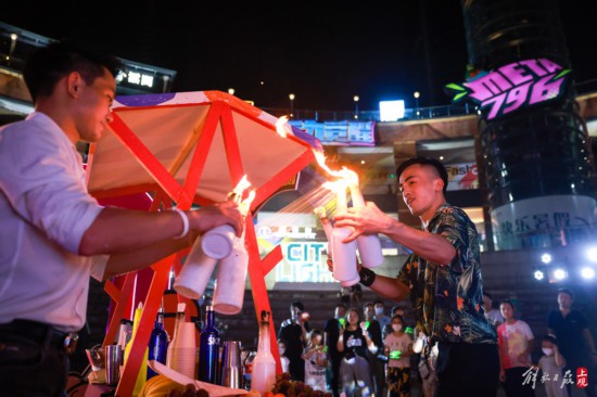 調酒師在下沉式廣場為觀眾進行現場表演。