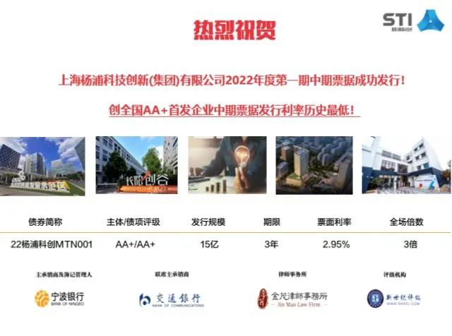 近日,上海楊浦科技創新(集團)有限公司2022年度中期票據成功發行。發行規模15億元,期限3年,票面利率2.95%。作為楊浦國企中首支發行的中期票據,此次發行進一步拓寬了科創集團的融資渠道,優化了負債結構,降低了融資成本。
