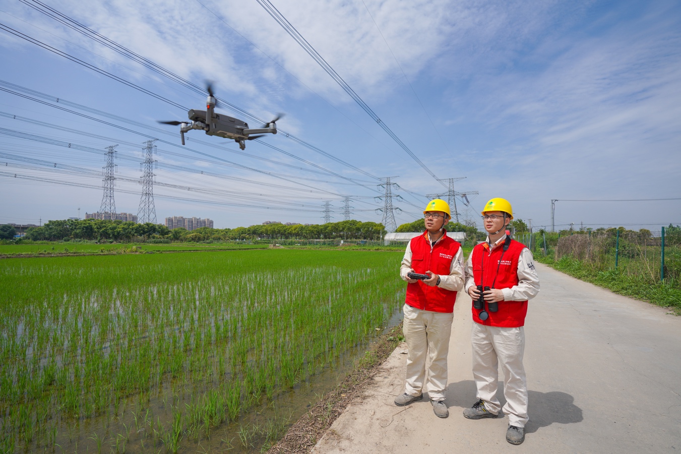 國網上海超高壓公司運維人員運用無人機技術,對重要輸電通道上的線路開展巡檢,保障申城電力“主動脈”安全暢通。