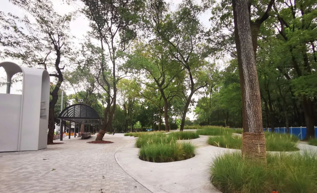 目前,中山公園圍墻打開工程已見雛形,從公園3號門走出來,慢行至2號門,一路綠蔭濃密,原本公園內的生態風貌融入道路街景,短短的700多米道路,一頭一尾是精心打造的梧桐廣場和兆豐廣場,中間又囊括了百年梧桐樹、銅頂、驛站、20路公交車站等多個景點,一路看下去,簡直應接不暇。