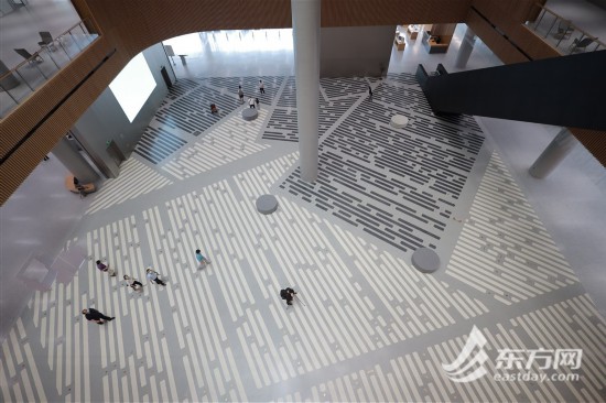 走進一樓中庭,讀者抬頭可見各個樓層、不同功能的開放空間,錯落有致。這里采用的是上下貫通的設計,引用了蘇州園林“太湖石”的概念,人們身處不同空間,依然可以實現視線交流。地面同樣富有設計感,上海本土藝術家申凡的作品《往來春秋》以老舊報紙為創作原型,隱去文字,保留并突出標點符號,表達段落結構的形式之美。