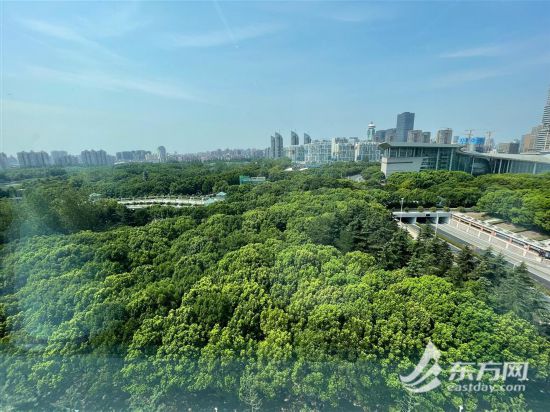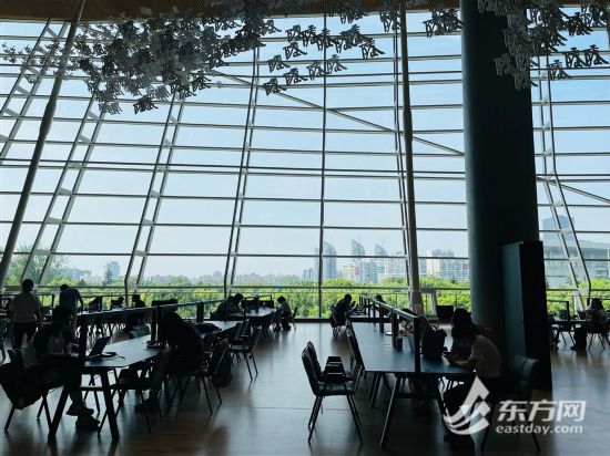 七樓的閱讀推廣區,“詩經過我們的生活”特展正在籌備中,未來洛天依將在這通過全息投影講《詩經》,并舉辦茶藝、香道等相關活動。穿過新書陳列區和“世界的閱讀者:閱讀迷宮”臨展,就能看到視野開闊的“城市客廳”?!吧蠄D東館最好的景觀在‘城市客廳‘?!别^員如是說。站在這,近可看毗鄰的一大片樹林,不遠處的世紀公園、上??萍拣^也盡收眼底。未來,“城市客廳”將面向讀者開放,根據不同時期的功能需求進行靈活的布局,可以辦展覽或活動等。
