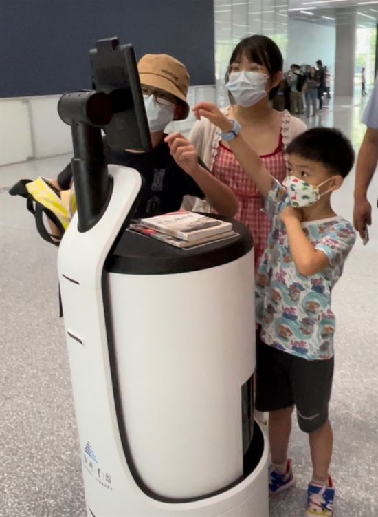 “您好,歡迎光臨上海圖書館東館,我是圖小靈1號,有什么可以幫您?”小讀者被一樓大廳中的機器人“館員”吸引,并嘗試還書。只要讀者對機器人說:“我要還書”,并將要還的圖書放在指定位置,機器人識別圖書信息,確認后放入“還書口”即可。據介紹,機器人主要分布在一樓和三樓。與之進行一番語音對話,它就可以為讀者提供圖書借閱、圖書查詢、圖書講解、圖書推薦、室內導航等服務。