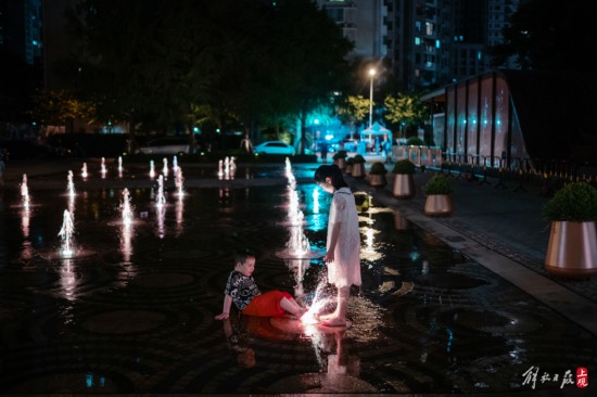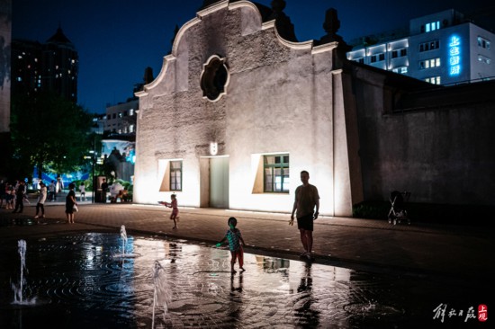 從定西路步行五分鐘,就來到各種網紅店的大合集,上生 新所。炎炎夏夜,這里門口的噴水廣場成了孩子們嬉戲的樂園。