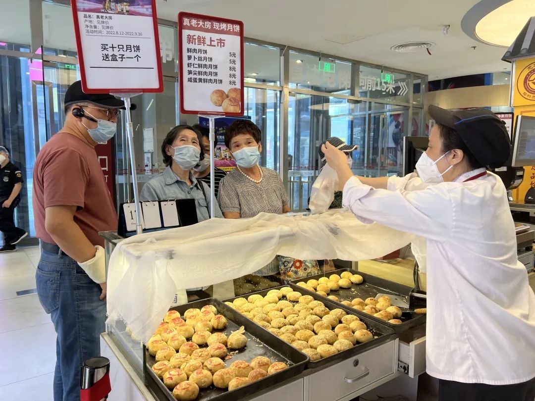 工作人員介紹,龍華素齋和真老大房在商場樓上都有制作坊,手工師傅們每天從上午八點忙到晚上八點,確保月餅當天現烤現賣。