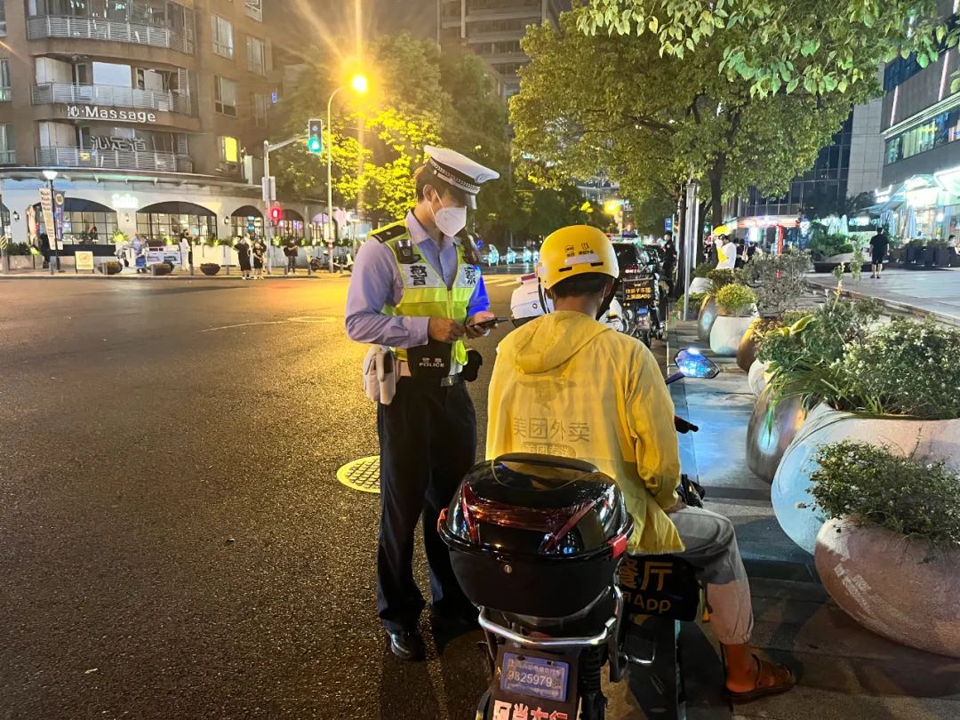 這是楊浦交警支隊在組織民警開展盤查工作,主要內容包括電瓶車闖紅燈、騎車人不戴頭盔、電瓶車不上牌照等違法行為。交警在大學路沿線設置盤查點,通過提高見警率,推動騎手依法依規使用電瓶車,提升交通安全守法意識。