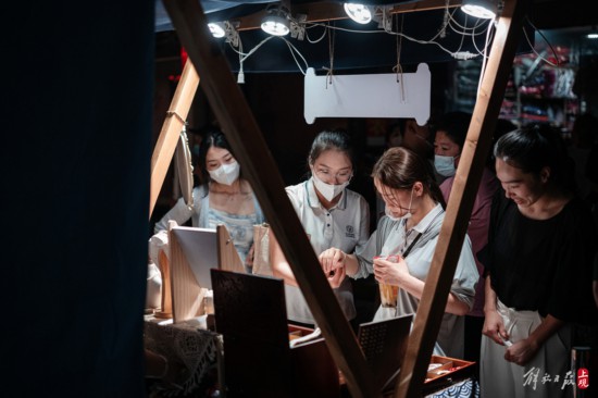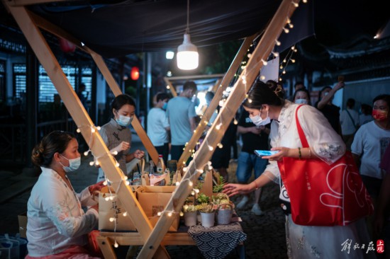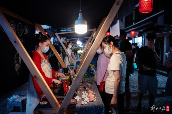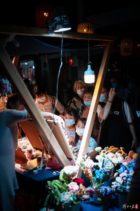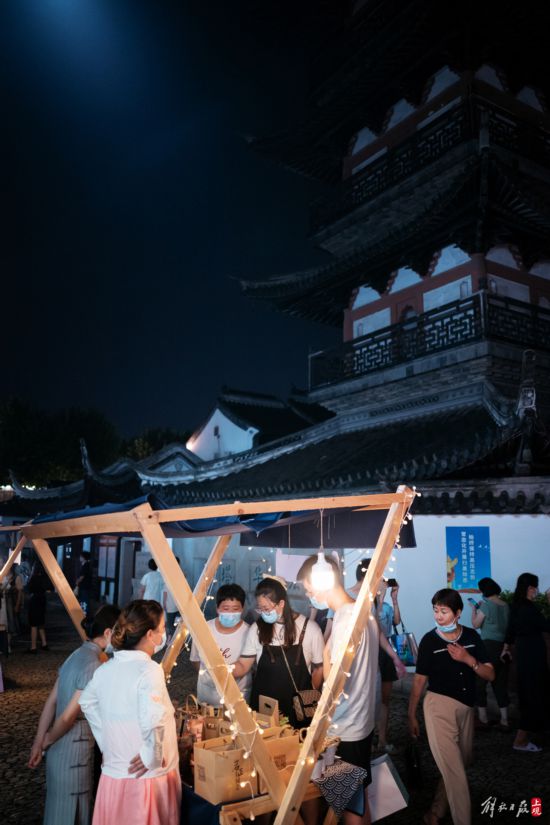 2022年8月20日晚,一場別開生面的市集活動在州橋景區開幕,青瓦白墻,石板路面,華燈初上;在江南阡陌縱橫的流水間搭建起一個個木質的攤位,游園的姑娘們穿起漢服在其中穿梭,讓人恍然間真有點穿越的感覺。