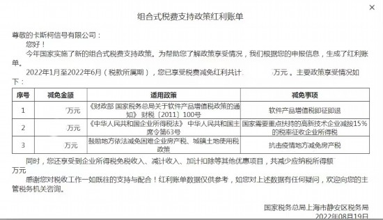 卡斯柯信號有限公司是中國鐵路行業第一家中外合資企業,扎根上海深耕軌道交通信號技術自主研發和創新,迄今已擁有500余項具有完全自主知識產權且與國際先進水平相當的系統技術和產品,服務范圍覆蓋國家鐵路、城市軌道交通、城際鐵路、有軌電車等各個領域。 “在稅務部門的宣傳和輔導下,我們企業享受到房土兩稅減免等多項優惠政策,但后續核算各項稅費數據也要耗費不少的精力?!笔盏蕉悇詹块T推送的紅利賬單后,企業財務負責人陳蕾十分驚喜:減免事項、減免金額、適用政策……一排排文字數據形成的“紅利賬單”,這樣一筆“明白賬”,企業當年所享受的稅費紅利躍然紙上、清晰可見。 “上半年我們享受稅費減免紅利近1.4億元,紅利明細一目了然,省去了我們不少功夫?!标惱俦硎?,“政策紅利在持續釋放,為企業發展加速;納稅服務也在不斷優化創新,為企業深度減負?!訙p法’并用,為企業在高鐵發展的世界賽道中從追趕者變為領跑者加油增能?!?據悉,目前“組合式稅費支持政策紅利賬單”的推送范圍已覆蓋“專精特新”中小企業、重點稅源企業、納稅信用級別為A級和B級的小微企業等。 珍島信息技術(上海)股份有限公司是一家專精特新企業,作為大數據產業領域中的佼佼者,對這份“紅利賬單”也非常有感觸。 “我們企業上半年享受了近60萬元的稅費紅利,通過稅收大數據形成的紅利賬單是一項全新的服務體驗,希望未來大數據能夠發揮更多積極作用?!逼髽I財務負責人劉瑩表示。 據了解,近年來,上海稅務部門深入貫徹落實中辦、國辦印發的《關于進一步深化稅收征管改革的意見》,以稅收大數據賦能精細服務,從2021年依托電子稅務局平臺推出的“政策速遞”功能,到此次的“組合式稅費支持政策紅利賬單”,納稅服務更加數字化、個性化、精準化。 國家稅務總局上海市稅務局相關負責人表示,下一步,稅務部門還將不斷創新稅費服務便民舉措,精準推送稅費優惠政策,持續優化稅收營商環境,讓納稅人繳費人盡知政策盡享紅利,全面提升市場主體的獲得感、滿意度。