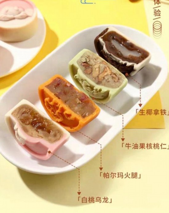 在口味方面包含了生椰拿鐵、牛油果核桃仁、白桃烏龍、帕爾瑪火腿等四款月餅?!澳滩杩谖对谠嘛炇袌錾贤κ軞g迎,我們在去年的基礎上進行了口味創新,來提高消費者的復購率?!敝庆o說。