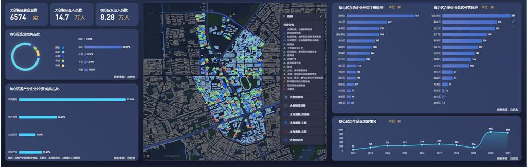 大創智區域集聚了4500余家企業,15萬名知識工作者,形成了商貿服務業、信息服務業、設計服務業等主導產業?!霸粕现恰被诖髣撝欠秶鷥人挟a業的數字化底座,整合了政府和企業的多項經濟社會數據,相當于在虛擬世界重新建設一個大創智。它從創智經濟、創新服務、創意生活、創享空間四個維度,構建數據體系圖譜,為數字化轉型和主導產業升級提供支持。