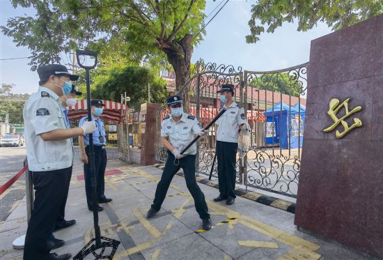 當天上午,在松江區岳陽幼兒園內,松江警方正會同區教育局、衛健委、市場監管局、消防支隊等多部門開展安全綜合督查檢查。治安支隊民警黃健、岳陽派出所民警陳昌兵對一鍵式緊急報警按鈕、視頻系統配備、校園安保力量等人防、物防、技防措施逐一查驗,要求保安熟練使用安保裝備并進行了現場模擬?!拔覀儗栏褡龅健环胚^任何一個漏洞,不丟掉任何一個盲點,不留下任何一個隱患’,確保新學期開學安全穩定?!眻@長周莉莉說。