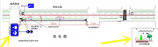 為此,警方將左轉車道與右側右轉車道進行了合并,并開啟了左轉相位燈,實現通行車輛導向的各行其道,減少了路口沖突點。將左側一車道變為僅直行,緩解了路口占比較高的直行車輛擁堵情況,也提高了接送孩子車輛的通行效率。同時,為了保障非機動車的暢通行駛,警方還將路口南側東西向斑馬線南移5米,并利用南側較寬的人行道渠化分離出西向北方向的非機動車,實現非機動車道的分道導向行駛,并做好前方的提示引導工作。