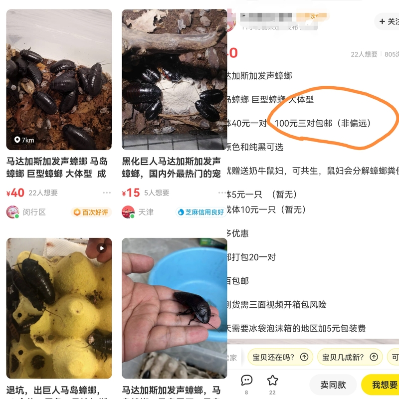 上??诎哆€曾截獲馬達加斯加鳴蠊,這種蟑螂能打架,會通過氣孔發聲,好比斗蟋蟀。記者發現,目前部分二手交易電商平臺仍在售賣,還用“100元三對包郵”來招攬生意。