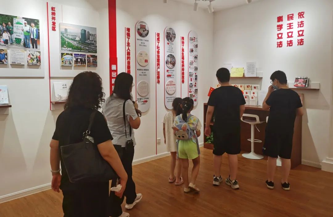 “第一次參加這種法治活動,有點好奇、期待?!焙⒆觽儗@趟普法“旅行”充滿了興趣?!昂鐦蚪值阑鶎恿⒎撓迭c既是全國人大常委會基層立法聯系點,也是上海市政府基層立法聯系點……”邊走邊聽,他們在一幅幅展板認真觀看,聽講解員講解,并提出各種各樣的問題。