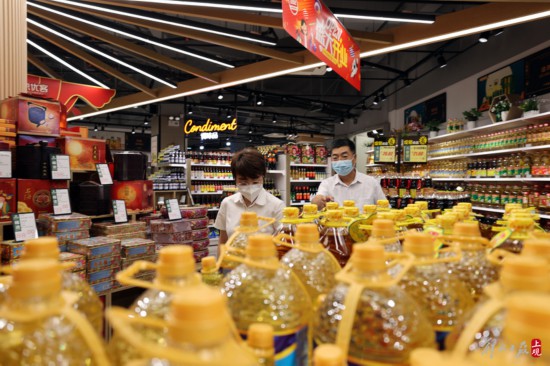2022年8月25日,市民在崇明東灘商務廣場京優客超市購物。近日,崇明東部地區最大的商業體東灘商務廣場開始營業。