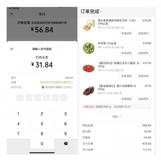 這些東西加起來正好56.84元,她在支付的時候,選擇微信支付,結算框自動彈出“滿50減25元消費券”,支付時只用了31.84元。劉女士打算周末再買一些全家聚餐的食材,用掉剩下的兩張優惠券。
