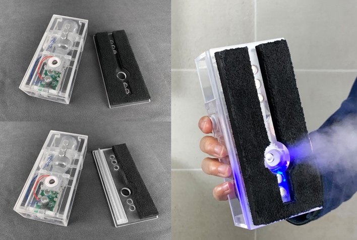 “根據把水霧化的原理,我覺得應用在這里也是合適的?!标惪『碌脑O計構思讓方案的可操作性更高。于是,他拆解了平時家用的小型噴霧器,把其中的霧化器,因地制宜地裝在他設計的白板擦中。除了核心的霧化裝置,其他的零件也都來自于日常用品:海綿來取自一些盒子的內包裝,絨布則從舊衣服上剪下來……雖然很多零部件易得,但也不是隨便拿來就用。比如白板擦的外殼,陳俊涵一開始想用質地軟、好裁切的雪弗板,但做好之后,發現用久了會受潮變形,于是最后選擇用亞克力板來做。