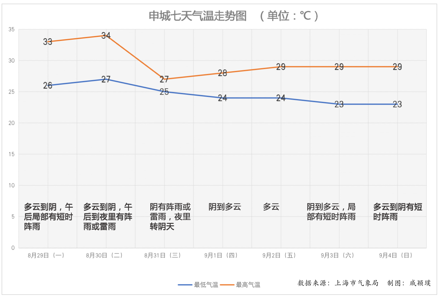 在度過了難得的清涼周末,上海市民又要感受熱度啦。上海中心氣象臺預報顯示,隨著副熱帶高壓進一步北抬,申城本周氣溫又有上揚勢頭。今天(29日),上海最高溫上升到33℃,周二暖空氣趁機加強,最高溫沖向34℃。