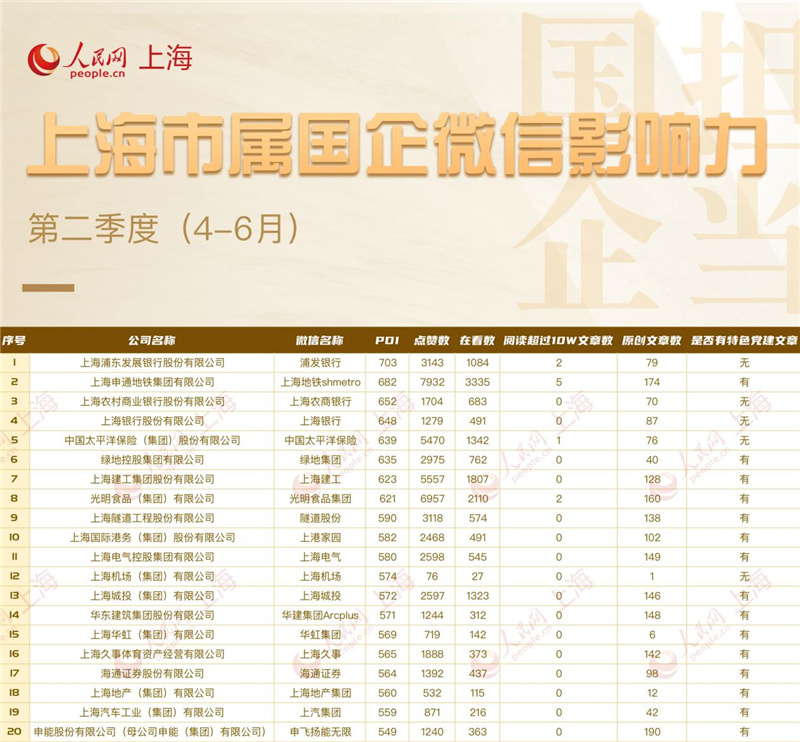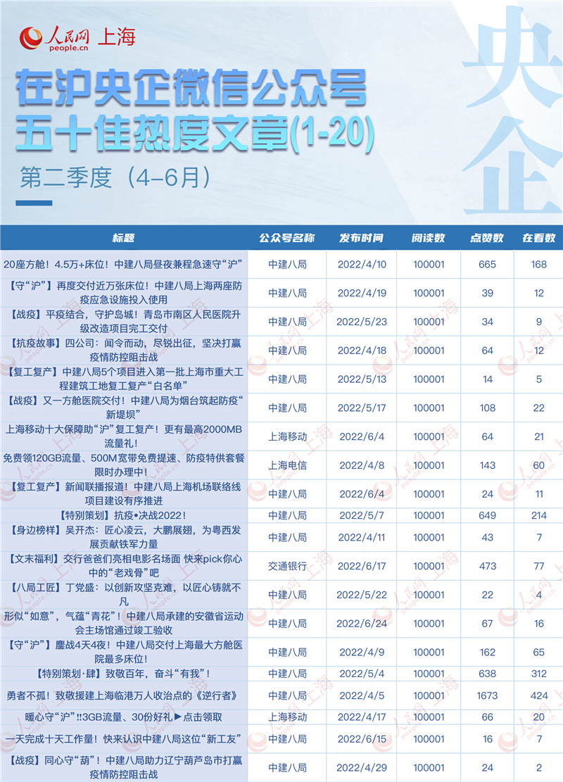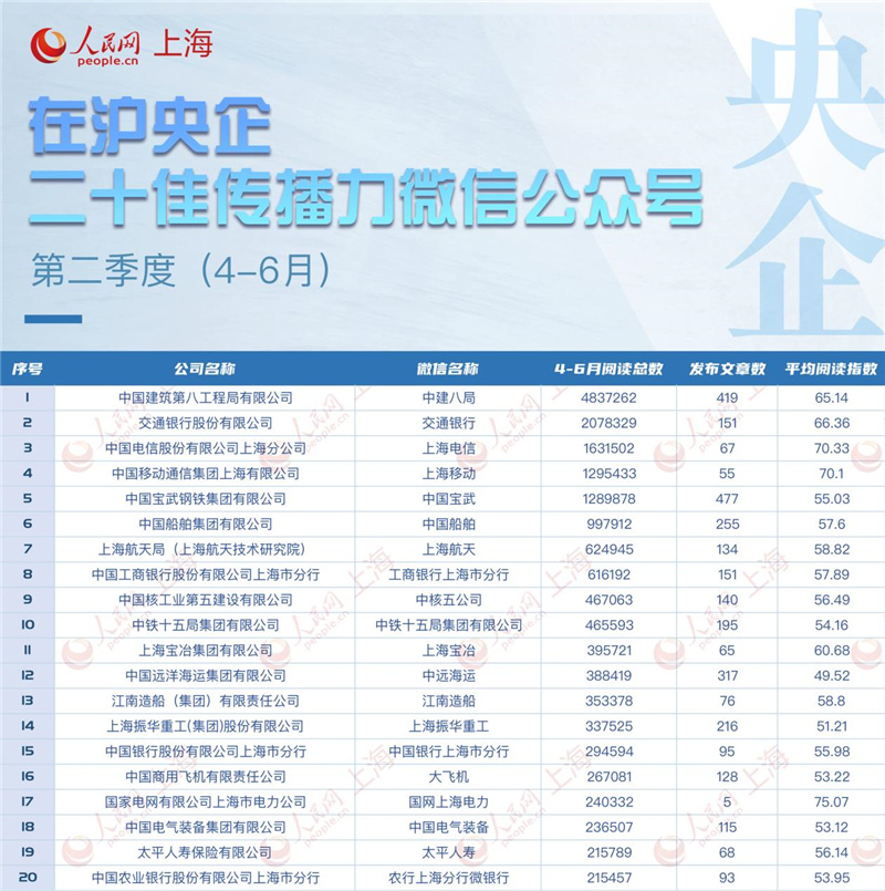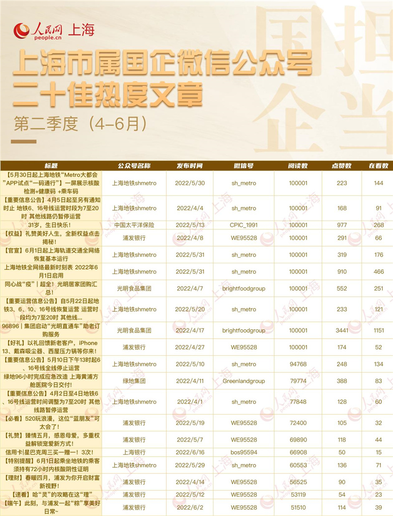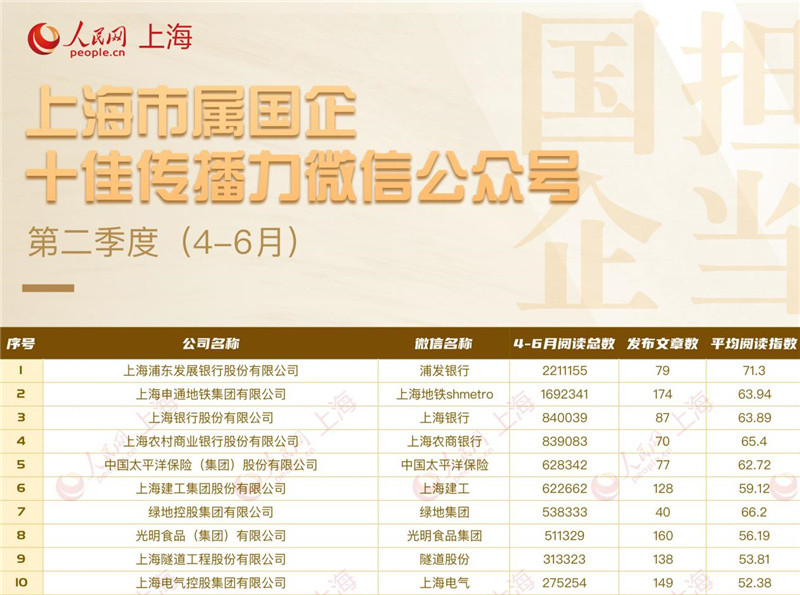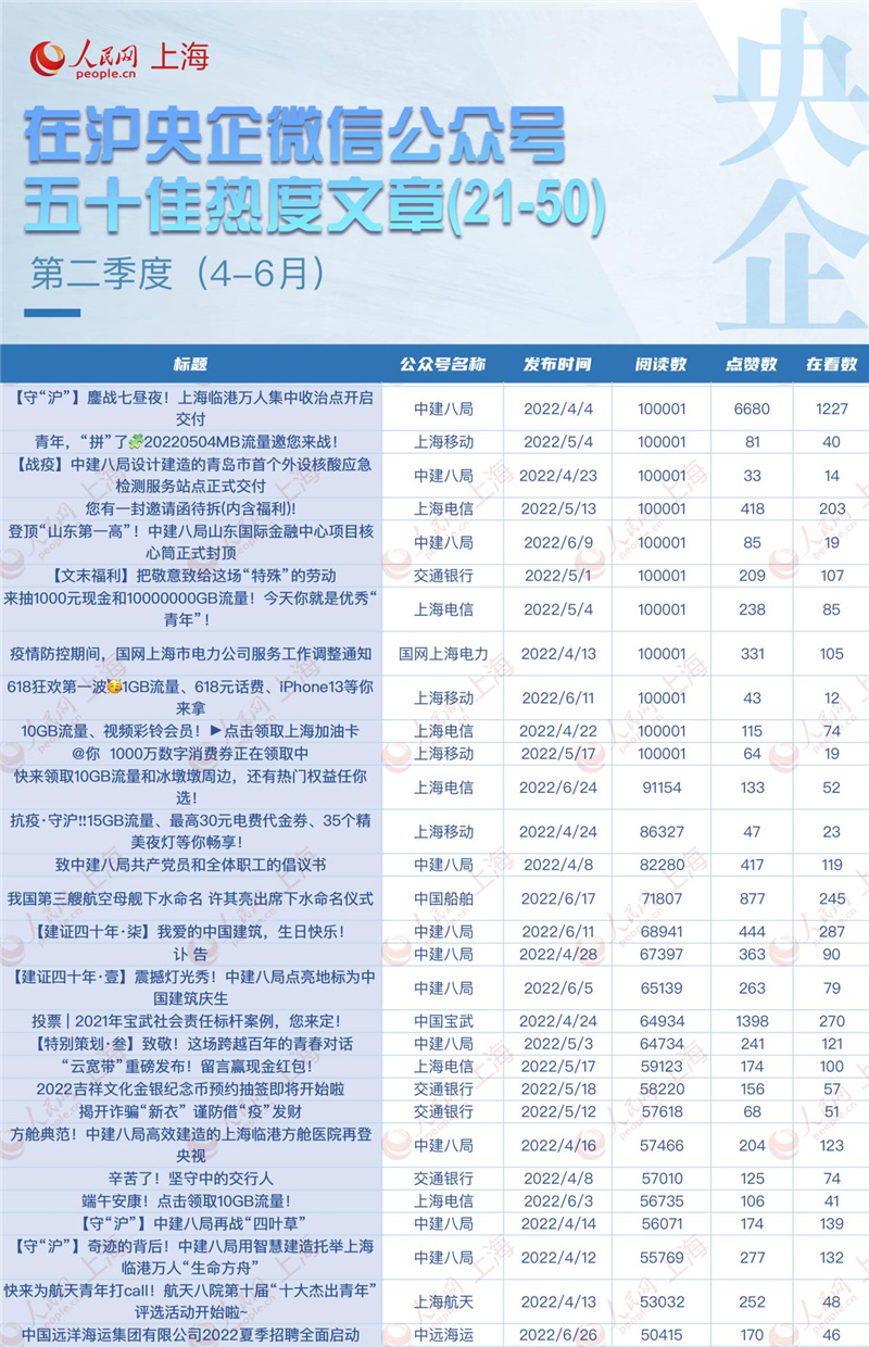 今年4月以來,人民網上海頻道首次對在滬央企、上海市屬國企的微信公眾號進行收集,并從公眾號閱讀量、點贊數、在看數、特色新聞內容等多個維度綜合分析,最終形成了《在滬央企、上海市屬國企微信公眾號傳播力指數》(2022年第二季度)。