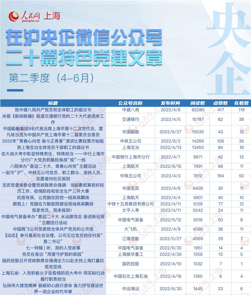 我們通過對80家在滬央企、39家上海市屬國企微信公眾號2022年第二季度(4—6月)的發布信息進行了持續關注和深度分析。并分別以特色黨建文章、單篇爆款閱讀量、微信公眾號總閱讀量、傳播力等個維度分別篩選出: