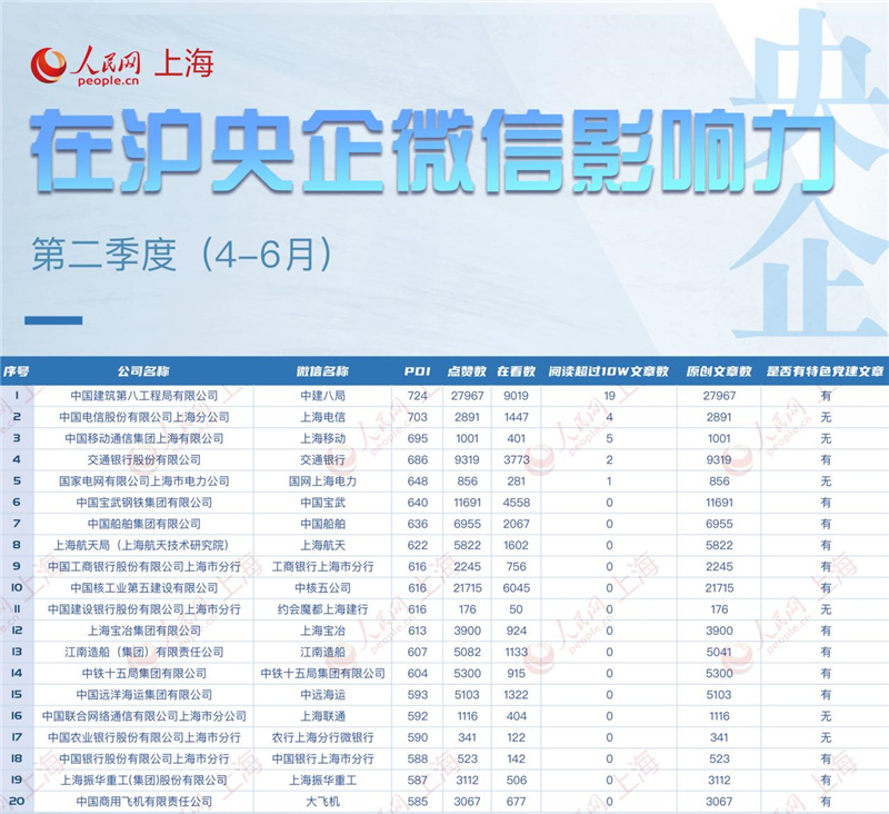 本期的微信影響力中,中建八局、上海電信、上海移動、交通銀行、國網上海電力、中國寶武、中國船舶、上海航天、工商銀行上海市分行、約惠魔都上海建行、中核五公司、上海寶冶、江南造船 、中鐵十五局集團有限公司、中遠海運、上海聯通、農行上海分行微銀行、中國銀行上海市分行、上海振華重工以及大飛機上榜。