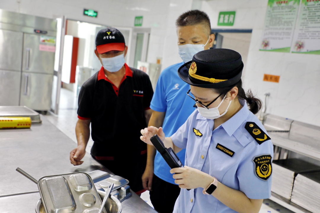 在上海市金山初級中學的食堂后廚,區市場監督管理局工作人員正在檢查廚房內的衛生情況,排查食品安全隱患,同時提醒食堂員工按規定使用水池,蔬菜、肉類等要分別在對應的清洗池清洗,確保師生“舌尖上的安全”。