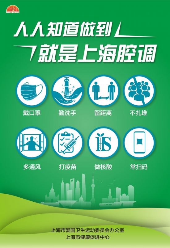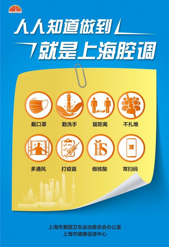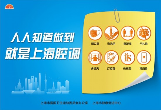 東方網8月31日消息:“人人知道做到,就是上海腔調!”開學在即,中秋國慶將至,為做好常態化疫情防控,筑牢全社會防疫屏障,市愛國衛生運動委員會辦公室、市健康促進中心今日(8月31日)特別推出一組海報,提醒廣大市民記牢健康防疫八個要點:戴口罩、勤洗手、留距離、不扎堆、多通風、打疫苗、做核酸、常掃碼。