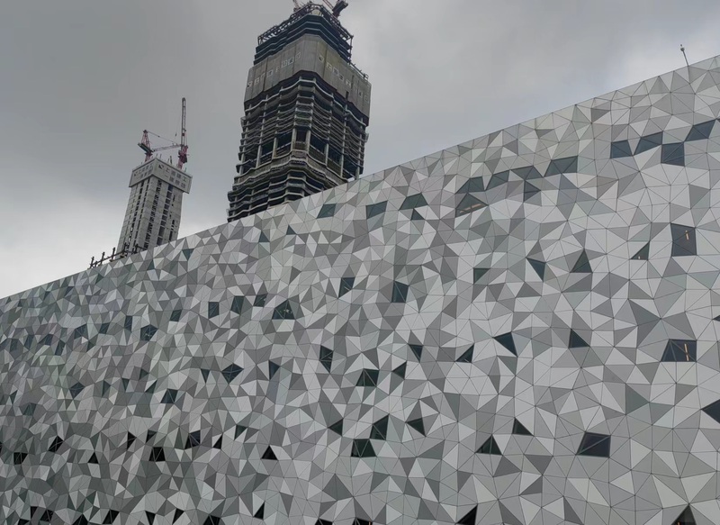 作為建筑的“衣服”,它的幕墻可能讓你一見傾心。3萬余片形態各異的三角形瓷板,從墨綠到淺灰的十種顏色漸變,看似隨意鏤空的玻璃……一天中的不同時間,或晴或雨的日子,它呈現著不一樣的美。