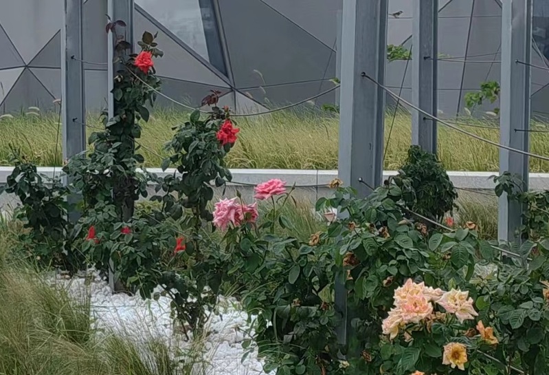 對于解放日報·上觀新聞記者而言,這是一種從未有過的體驗——明明是一座人工建筑,怎么會與大自然如此接近。從戶外一樓沿著旋轉步道往上走,可以到達張江科學會堂的屋頂,那里有一個種植著葡萄和玫瑰的花園。一路上,你可以看到川楊河和智慧河的流淌,聞到花草的清香,張開雙臂似乎天空就僅在咫尺。最讓人印象深刻的是,在接近屋頂花園的開闊步道上,目光所及之處綠意蔥蘢。由于視角的原因,周圍的建筑大都隱去了,讓人感嘆:不識會堂真面目,只緣身在自然中。