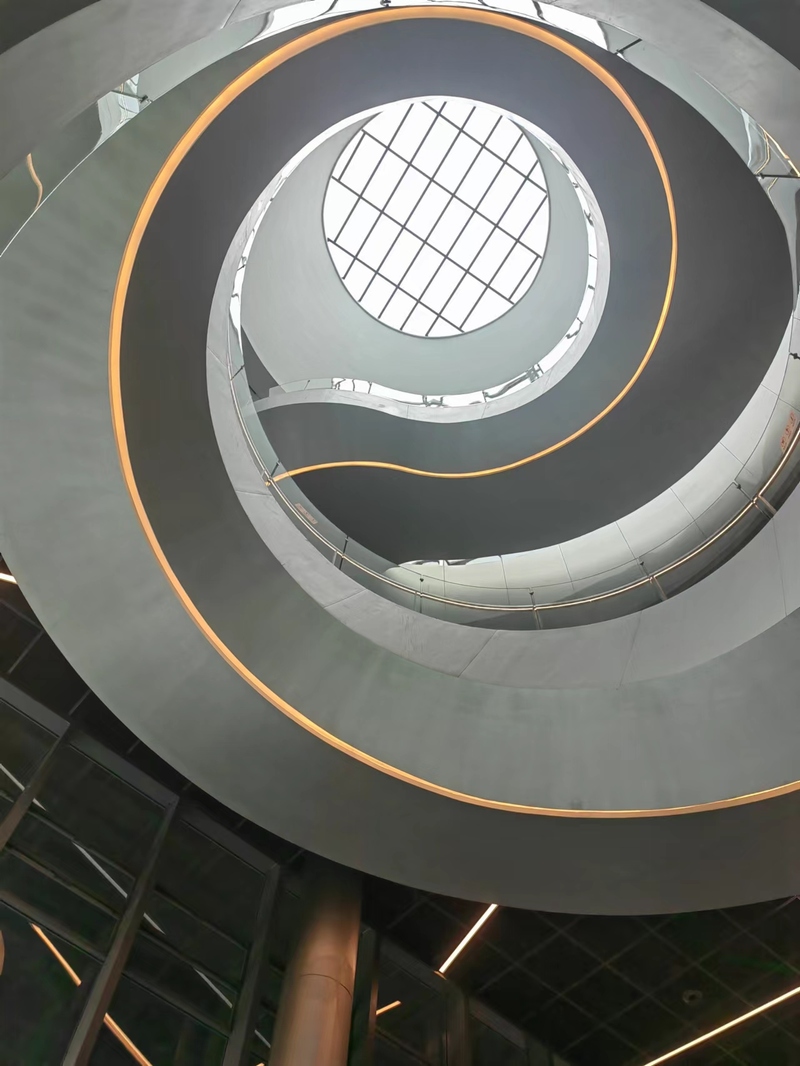 這種與大自然的連接,就算身處張江科學會堂的主體建筑里面,也能感受到。在序廳,有一個旋轉式樓梯,抬頭即可仰望蒼穹。更不用說,那些轉角遇到的幕墻鏤空玻璃,總是不經意傳遞著大自然的信息,或日出日落,或風或云,或一抹綠色。