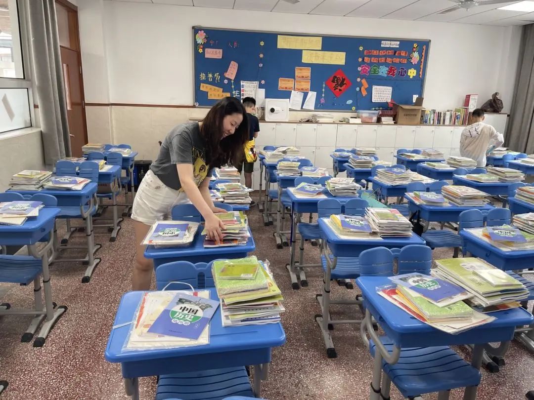在沒有返校環節的情況下,為確保開學第一天能夠順利開展教學工作,學校老師們將課本進行整理、搬運、并且分發到每一位同學的書桌上,提前營造優美的教室環境,汗水浸濕了老師的衣衫卻也沒抵擋住她們欣慰的微笑。