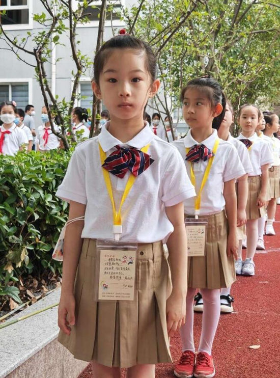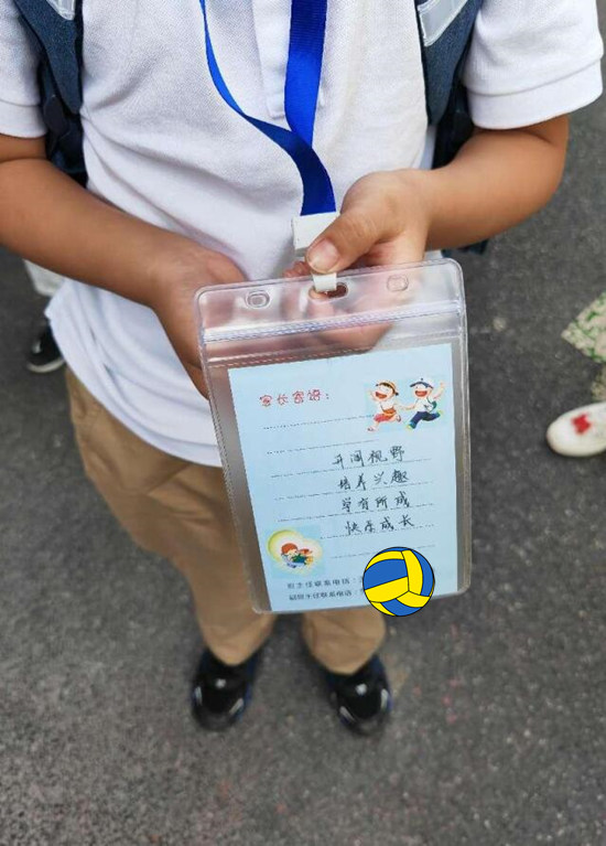 一大早,校園里歡聲笑語不斷。為了讓孩子們盡快熟悉校園生活,虹口區曲陽路四小每一位一年級“萌新”都有一個彩色胸牌,不同班級的胸牌顏色不同,胸牌上一面寫著孩子的班級、姓名,另一面則寫著“家長寄語”,讓孩子們時刻感受到家長的陪伴。