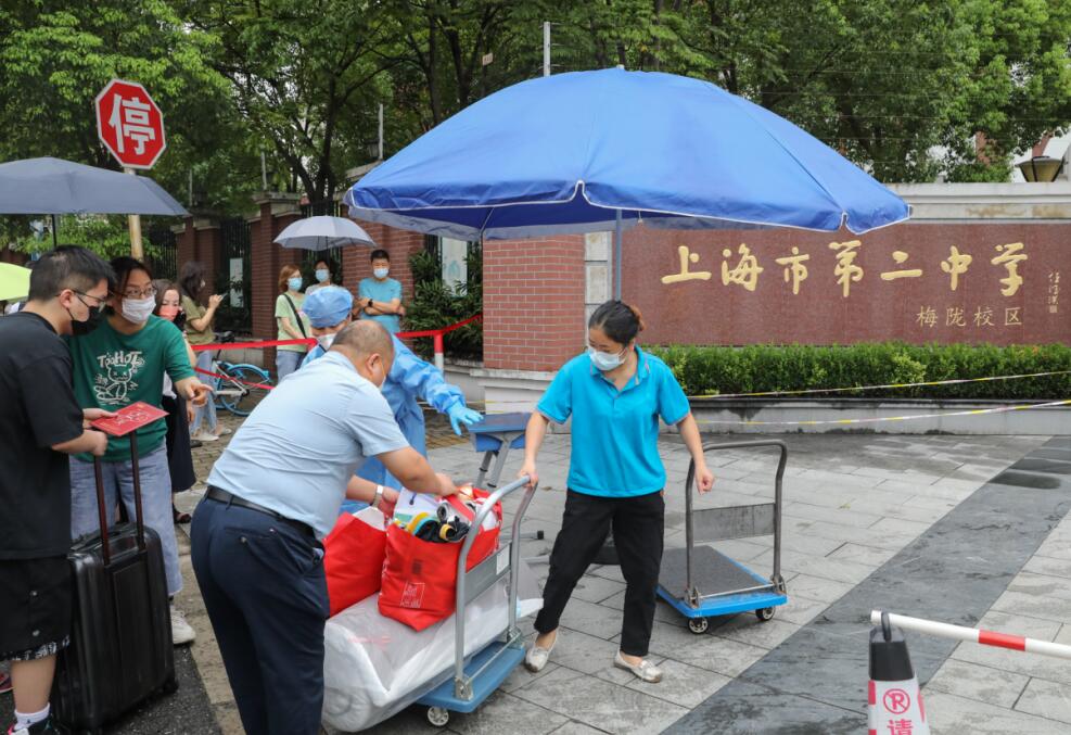 在上海市第二中學梅隴校區門口,一大早,學校志愿者老師們迎接學生的到來,幫助住校學生搬運行李。