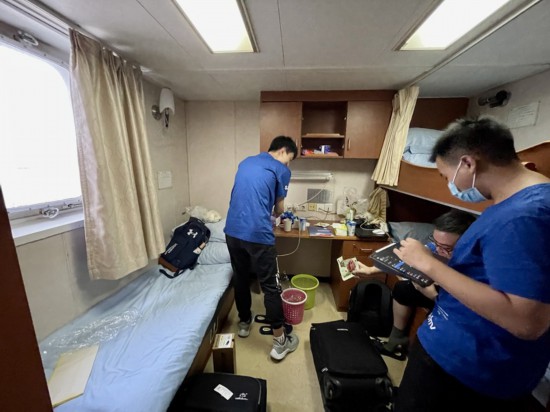 師生登船后,開展了棄船演習、消防演習等應急演練,并再次開展作業安全教育,提高師生海上安全意識。在雙方專業教師帶領下,學生們將分組進行海上走航觀測,作業內容包括:舯部CTD作業、浮游生物垂直拖網、艉部箱式和多管沉積物采樣等。同時,學院還鼓勵同學在船上幫廚、打掃衛生,培養尊重勞動、積極勞動的美德。