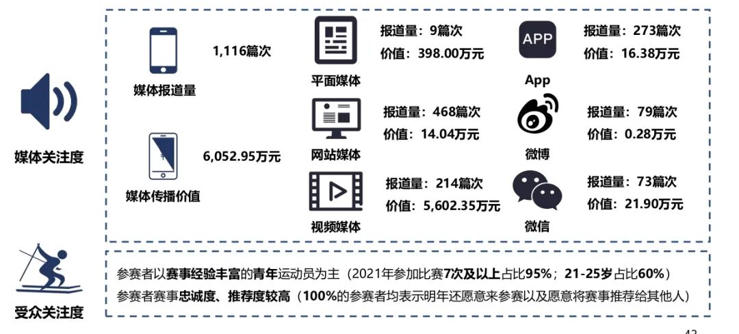 在關注度方面,滑雪巡回賽引發各類型媒體報道1,116篇次,其中,央視視頻對賽事進行了14,267秒的直播報道。在專業度方面,滑雪巡回賽的總體滿意度達90%,其中評價最高的是“工作人員服務專業”。