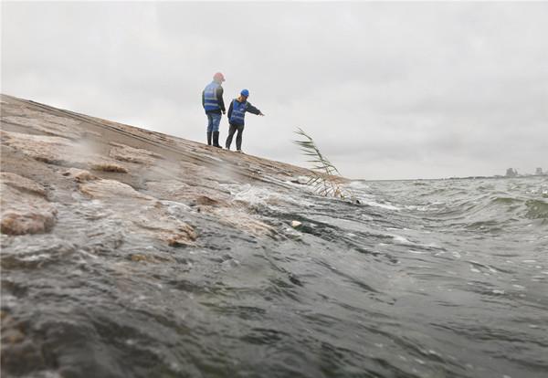 圖說:金山區海洋海塘管理所工作人員在一線海塘巡查,檢查海塘設施是否有損壞,確保堤壩安全。本報記者 陶磊 攝