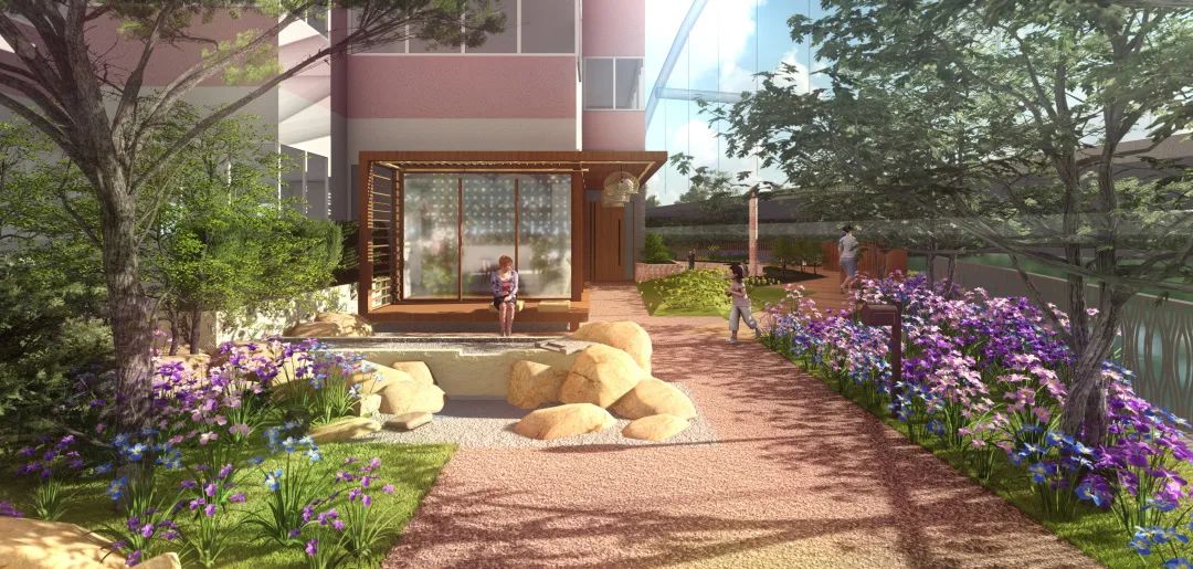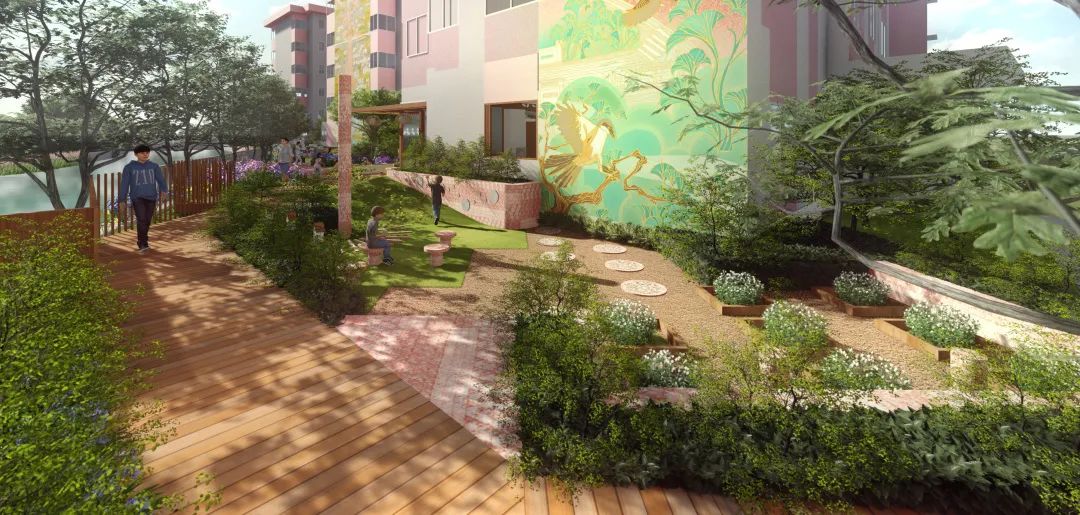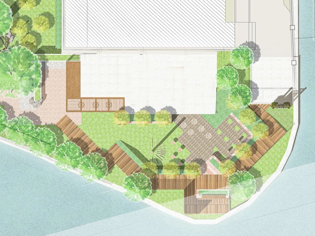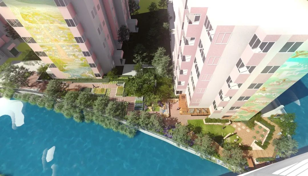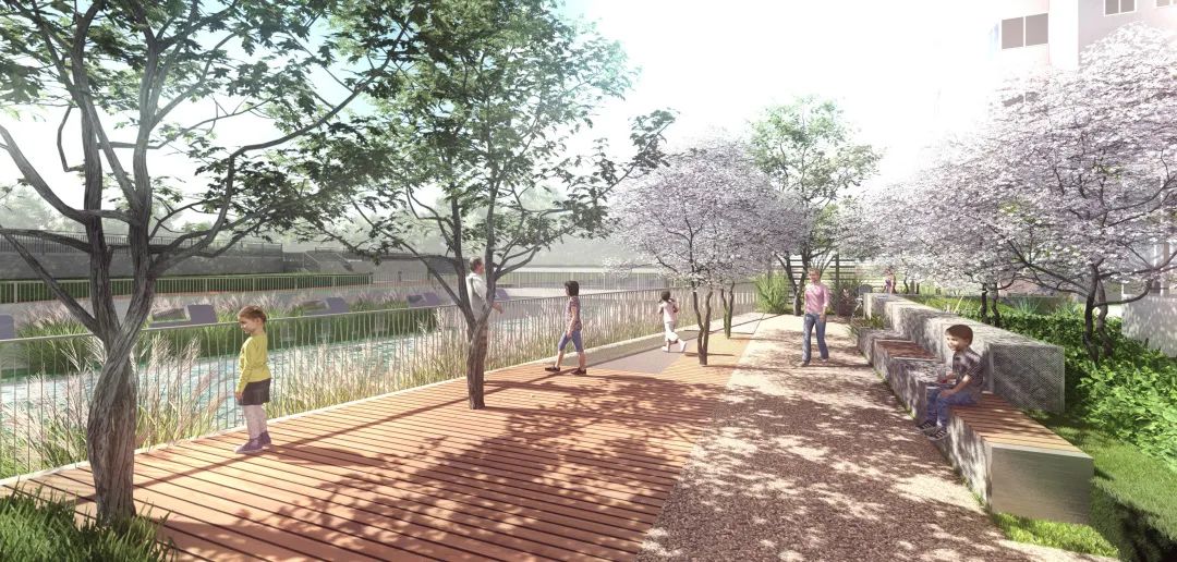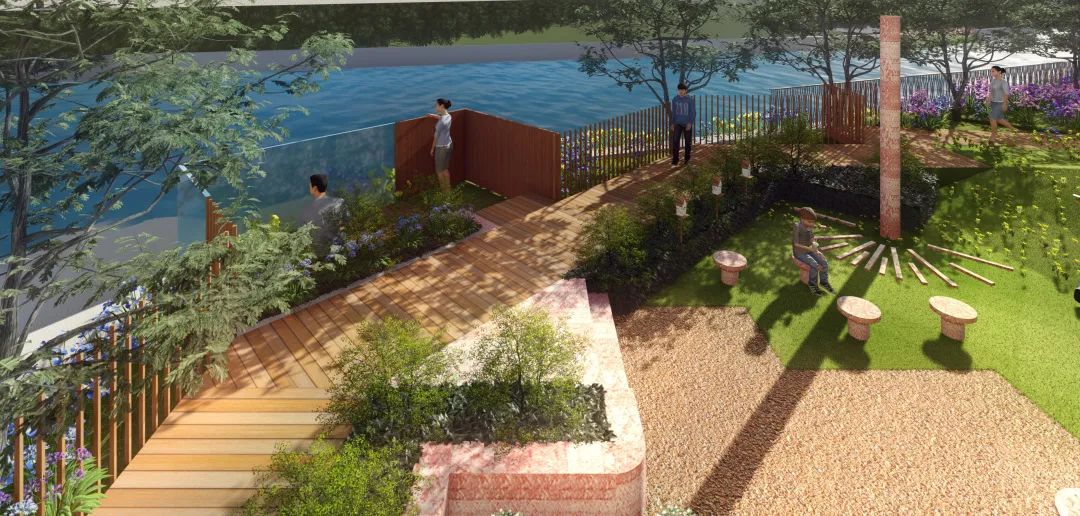 此處沿河的高圍墻將被拆除改建成扶手欄桿,打開河岸視野,并且在保證不影響岸邊動物的前提下,設置可以靠近水岸的觀景平臺和休憩設施。與此同時,融入河岸文化展示,為居民打造一個可以邊走到河岸邊看邊讀邊玩的水岸生境花園。