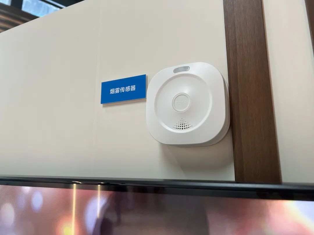 幾乎每走幾步就能遇到驚喜,比如入門的開放式廚房頂部,裝著煙霧傳感器和燃氣傳感器,可及時感知屋內危險情況。而當步入客廳,擁有高清晰度與色彩還原度的8K電視又讓人挪不開眼。