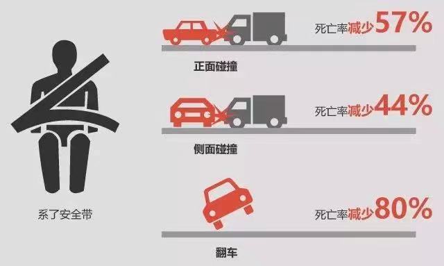 從統計數據分析來看,在發生正面碰撞時,如果系了安全帶,可使死亡率降低57%;在發生側面碰撞時,如果系了安全帶,可使死亡率降低44%;在發生翻車事故時,如果系了安全帶,可使死亡率降低80%。