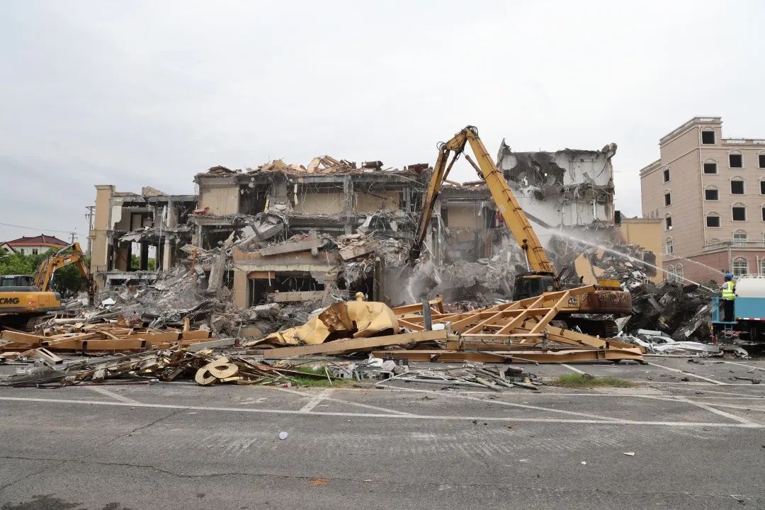 根據規劃,近期朱涇鎮啟動了B17-04地塊(廣緣大酒店)建筑物拆除工作。目前,廣緣大酒店周邊已經被圍擋遮蔽,圍擋內部分建筑物已經拆除,在噴水車的配合下,樓體拆除的揚塵減少,預計還需要一周時間完成全部拆除和建筑垃圾清運。