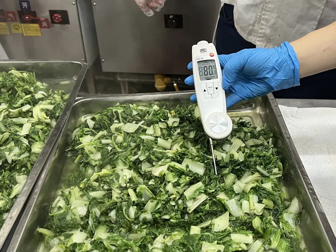 “要保證成品菜燒熟煮透的話,菜的中心溫度應該要達到70攝氏度以上?,F在測量結果是80攝氏度,說明這菜已經煮透了,可以放心給師生食用?!奔闻d市場監管所副所長韓雯向記者介紹。