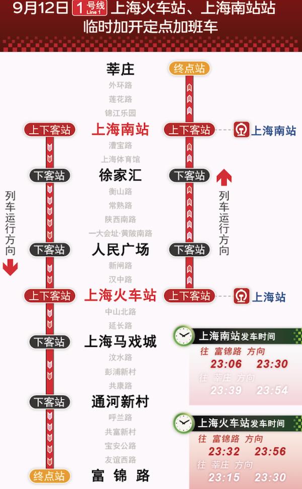 其中,1號線上海南站站往富錦路站方向定點加班車沿途僅??啃旒覅R站、人民廣場站、上?;疖囌菊?、上海馬戲城站、通河新村站、富錦路站,其余車站跳停。??寇囌局?,上海南站站、上?;疖囌菊究缮舷驴?,其余各??空径贾荒芟驴?,途經換乘站不可換乘。1號線上?;疖囌菊就非f站方向定點加班車沿途僅??咳嗣駨V場站、徐家匯站、上海南站站、莘莊站,其余車站跳停。??寇囌局?,上?;疖囌菊?、上海南站站可上下客,其余各??空径贾荒芟驴?,途經換乘站不可換乘。