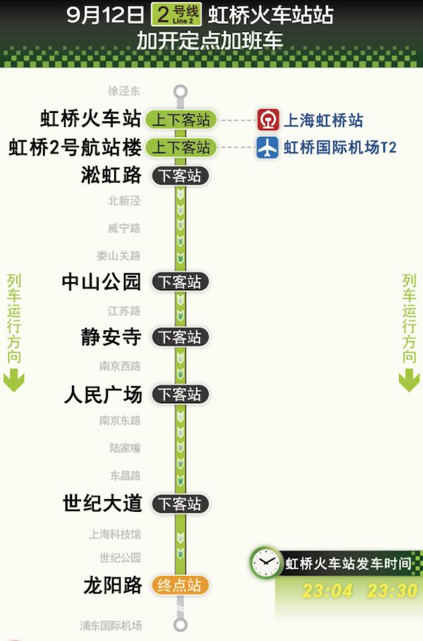 2號線定點加班車始發站虹橋火車站站,終點站龍陽路站,中途??亢鐦?號航站樓站、淞虹路站、中山公園站、靜安寺站、人民廣場站及世紀大道站。其中,除始發站虹橋火車站站及虹橋2號航站樓站可上下客,其余各??空径贾荒芟驴?,途經換乘站不可換乘。
