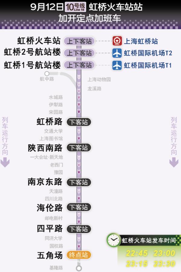 10號線虹橋火車站站往五角場站方向定點加班車,沿途僅??亢鐦蚧疖囌菊?、虹橋2號航站樓站、虹橋1號航站樓站、虹橋路站、陜西南路站、南京東路站、海倫路站、四平路站、五角場站,其余車站跳停。??寇囌局?,虹橋火車站站,虹橋2號航站樓站、虹橋1號航站樓站可上下客,其余各??空径贾荒芟驴?,途經換乘站不可換乘。