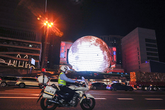在徐家匯空中連廊上,美羅城外的3D裸眼球形屏幕“升起一輪明月”,也引來不少群眾駐足拍照?!皝?,當心,別人拍照,小朋友不要撞上了,拍完的也趕緊走起來了?!毙旒覅R派出所民警在天橋處加強巡查,提醒孩子家長和拍照的群眾注意安全。