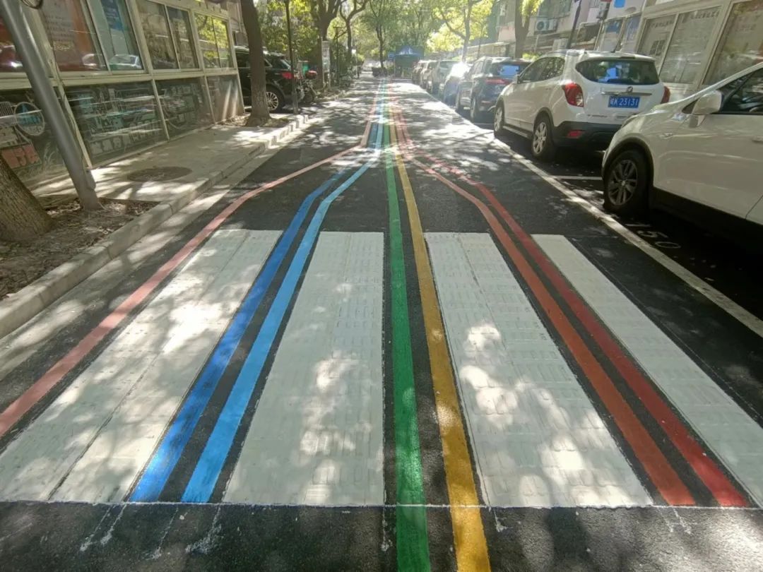 新涇鎮淞虹公寓11000平方米的道路不僅規劃了七彩的引導線,還安裝了地磁停車感應器,不久便可以和智慧顯示屏聯動,讓普普通通的回家路變得既美觀安全又“智慧聰明”!