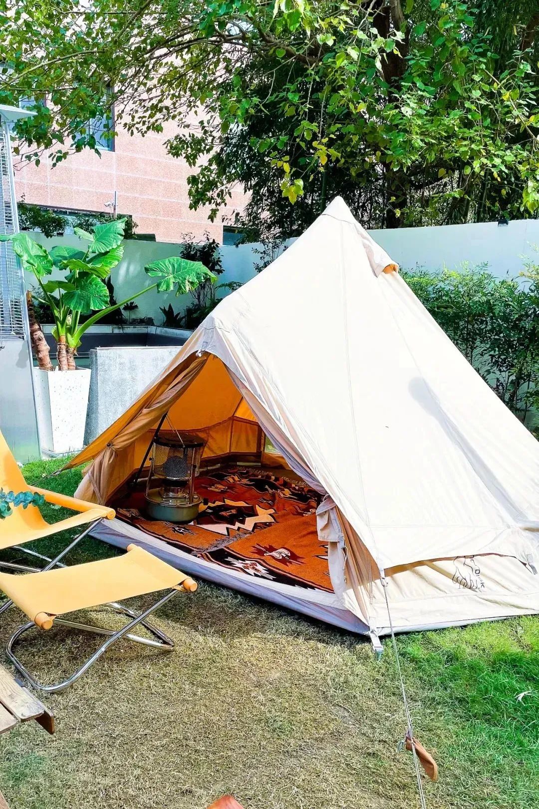 室外是純正的露營場景,帳篷、油燈等裝置隨處可見,到了夜晚還會烤起火爐,氛圍感拿捏得穩穩的,再加上蘆葦、銀杏葉這些元素,恍惚間真的仿佛覺得自己來到了山野田園之間。