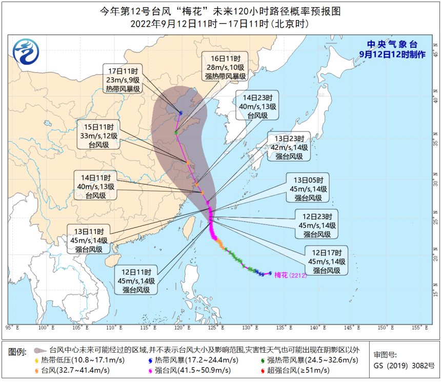 上海中心氣象臺監測顯示,昨天(12日)13時,今年第12號臺風“梅花”(強臺風級)位于浙江省舟山市南偏東方向約630公里洋面上,中心附近最大風力有14級,七級風圈半徑220到260公里。預計,“梅花”將以每小時5到10公里的速度,向偏北方向移動,昨天夜間進入東海南部海域,逐漸向浙江東部沿??拷?。14日夜間到15日白天,在浙江北部到江蘇南部沿海地區登陸或擦過(臺風級),之后繼續北上。